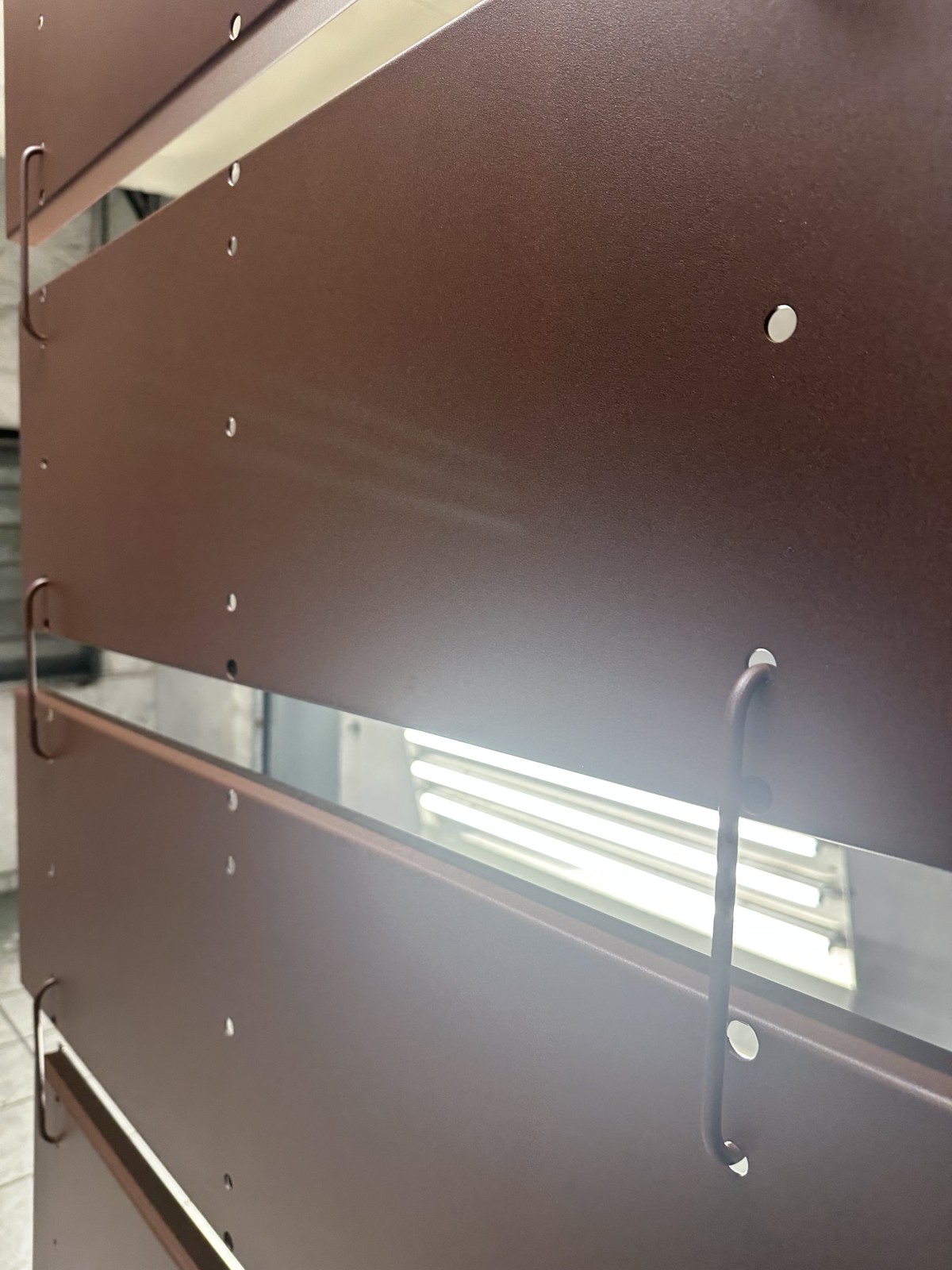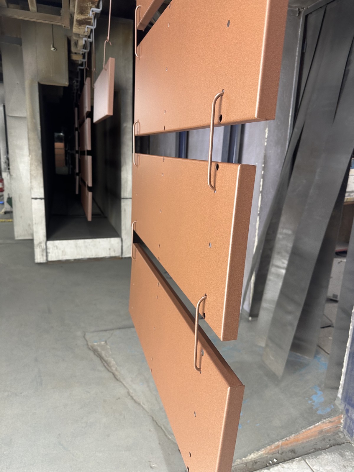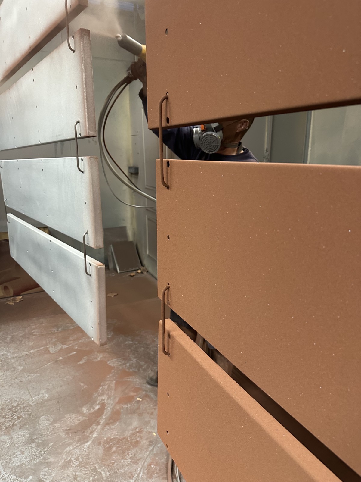 Le procédé repose sur une préparation soignée des supports métalliques, un traitement de surface précis et l’application électrostatique de poudres spécifiques conçues pour reproduire l’effet rouille. La cuisson en étuve à haute température garantit une excellente adhérence, une résistance mécanique élevée et une protection anticorrosion efficace. L’aspect visuel conserve la profondeur et les nuances du métal patiné tout en assurant une tenue longue durée.